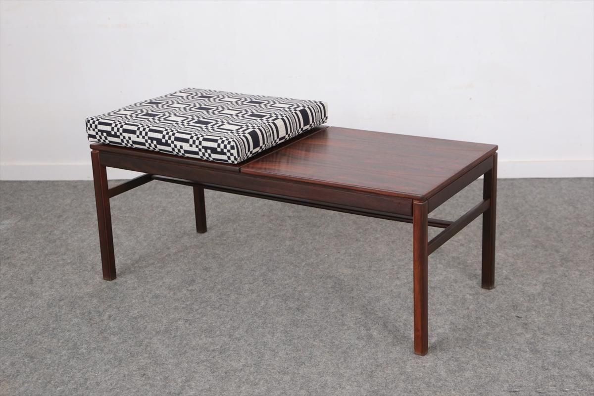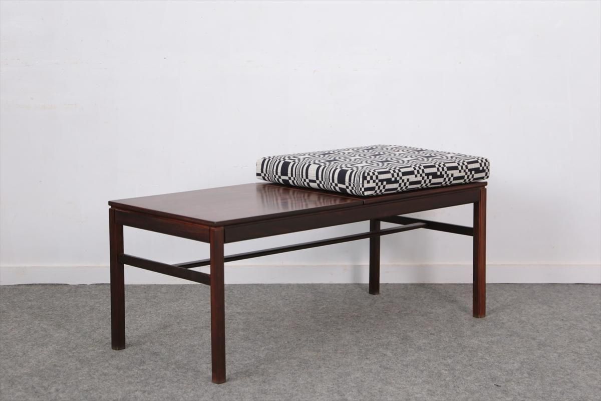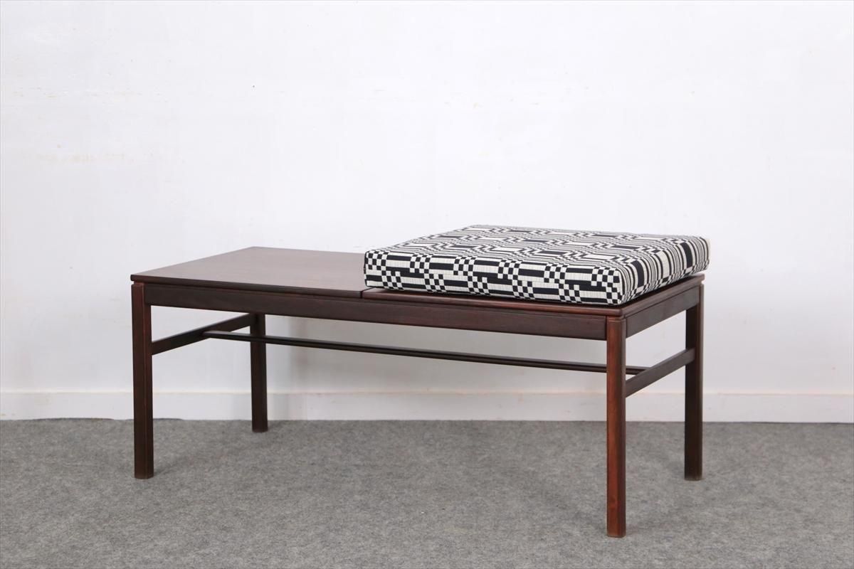 スウェーデンのローズウッドのテレフォンベンチです。 スウェーデンの家具メーカーTingstrom社で製造されていた「CASINO」というシリーズで Sven EngstromとGunnar Myrstrandの二人によるデザインです。 四角い脚や細い貫がすっきりとしたシンプルなデザインです。 2枚に分かれた天板は脚にスタッキングされており、簡単に取り外せる構造です。 1960年代の販売当時は、半分にチェストやシートなどを自由に組み合わせて選べるようなスタイルだったようです。ベンチとしてもサイドテーブルとしても様々にお楽しみいただけます。 クッションはフィンランドのテキスタイルブランドJohanna Gullichsen(ヨハンナ・グリクセン)の「Doris/ドリス(BK)」(綿100%)の生地で張替ました。グラフィックパターンを織りで表現したテキスタイルは、奥行のあるしっかりとした素材で、色合いも美しく、季節を通してお楽しみいただけます。 多少使用感はありますが、良いコンディションです。