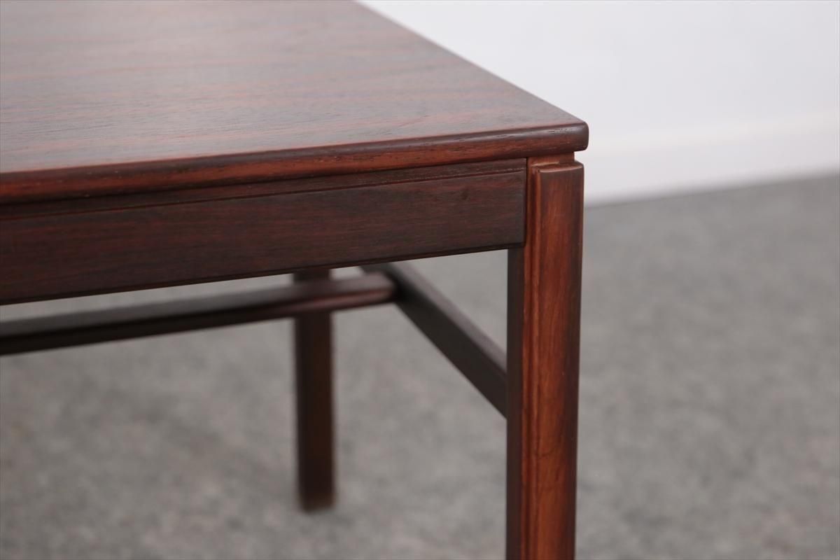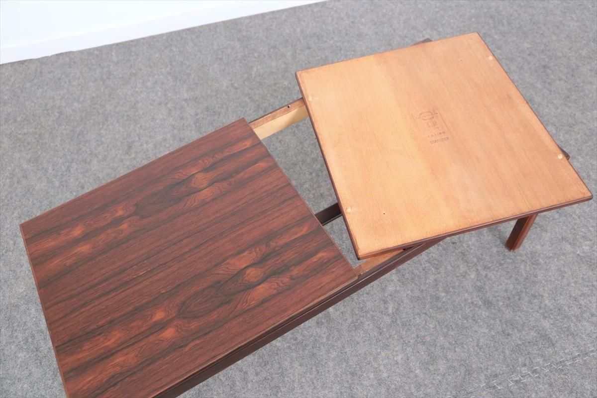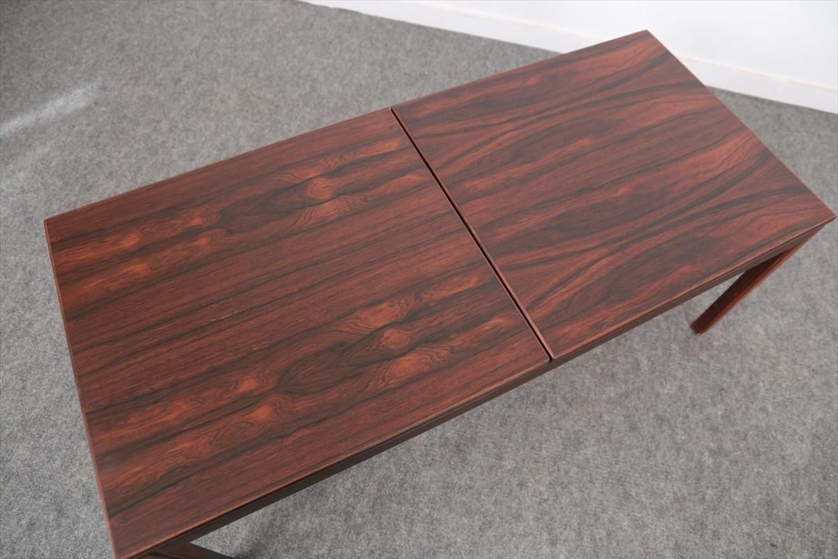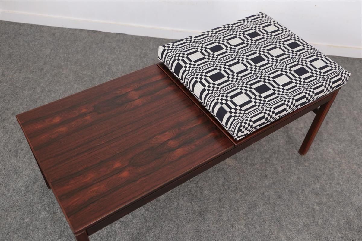 スウェーデンのローズウッドのテレフォンベンチです。 スウェーデンの家具メーカーTingstrom社で製造されていた「CASINO」というシリーズで Sven EngstromとGunnar Myrstrandの二人によるデザインです。 四角い脚や細い貫がすっきりとしたシンプルなデザインです。 2枚に分かれた天板は脚にスタッキングされており、簡単に取り外せる構造です。 1960年代の販売当時は、半分にチェストやシートなどを自由に組み合わせて選べるようなスタイルだったようです。ベンチとしてもサイドテーブルとしても様々にお楽しみいただけます。 クッションはフィンランドのテキスタイルブランドJohanna Gullichsen(ヨハンナ・グリクセン)の「Doris/ドリス(BK)」(綿100%)の生地で張替ました。グラフィックパターンを織りで表現したテキスタイルは、奥行のあるしっかりとした素材で、色合いも美しく、季節を通してお楽しみいただけます。 多少使用感はありますが、良いコンディションです。