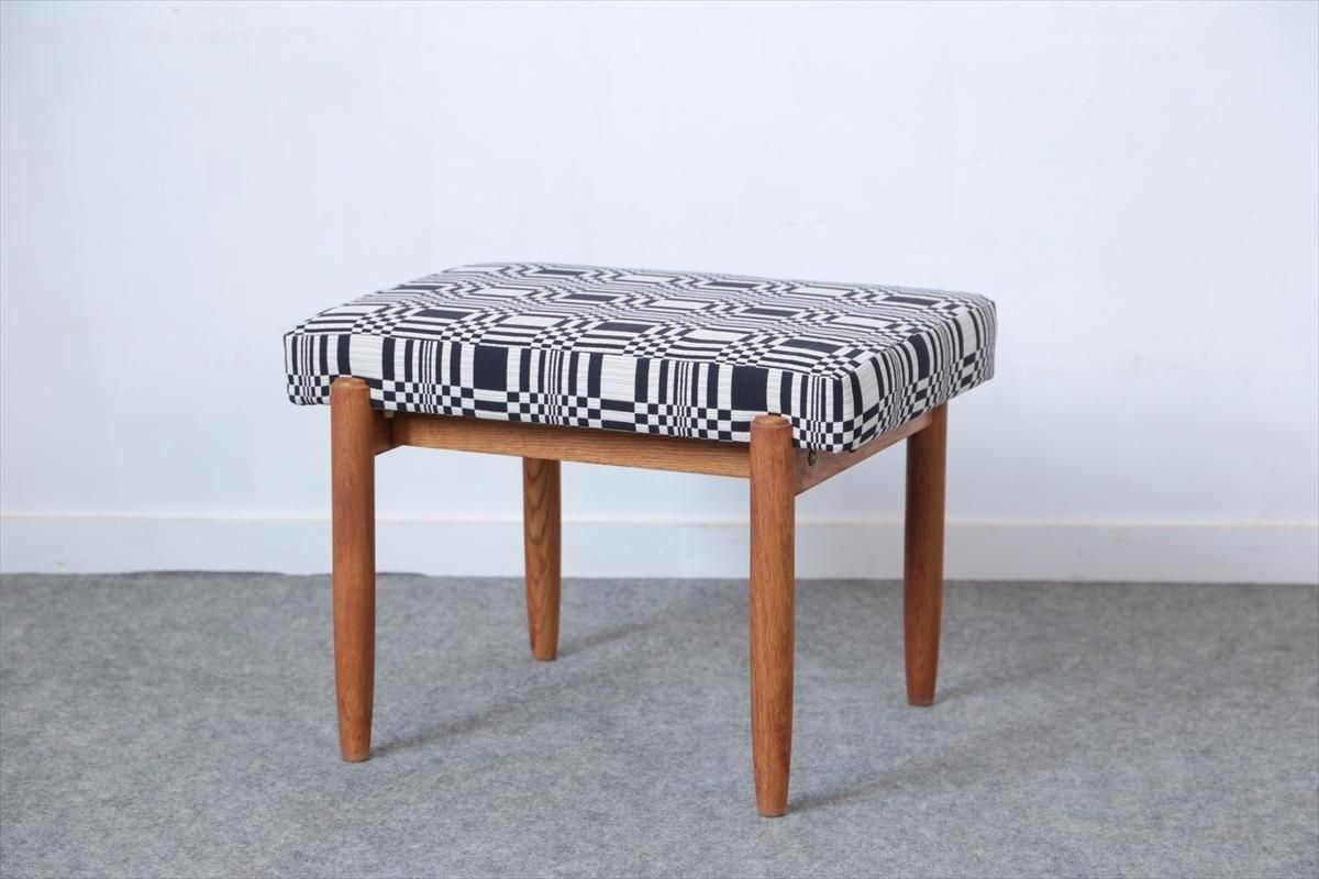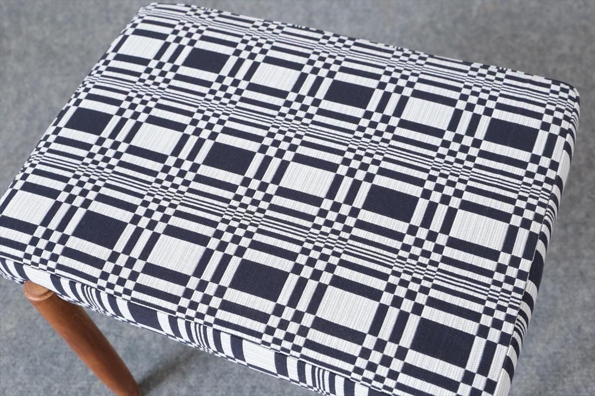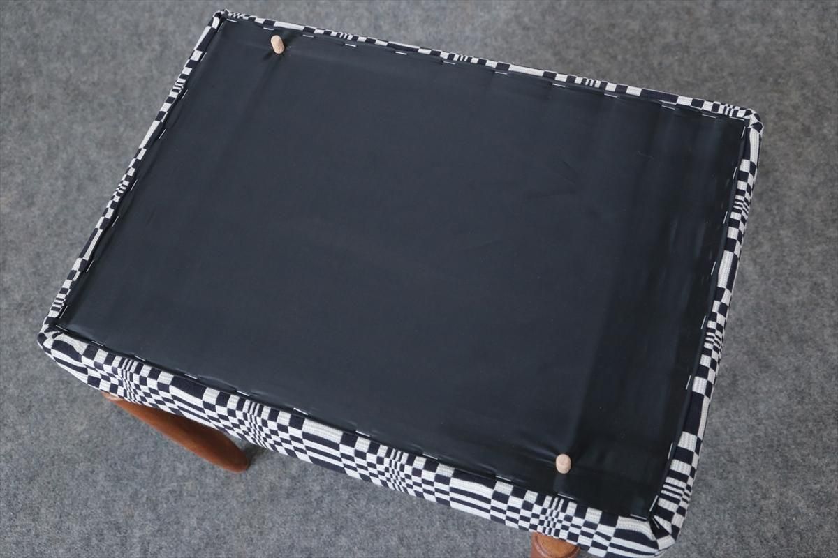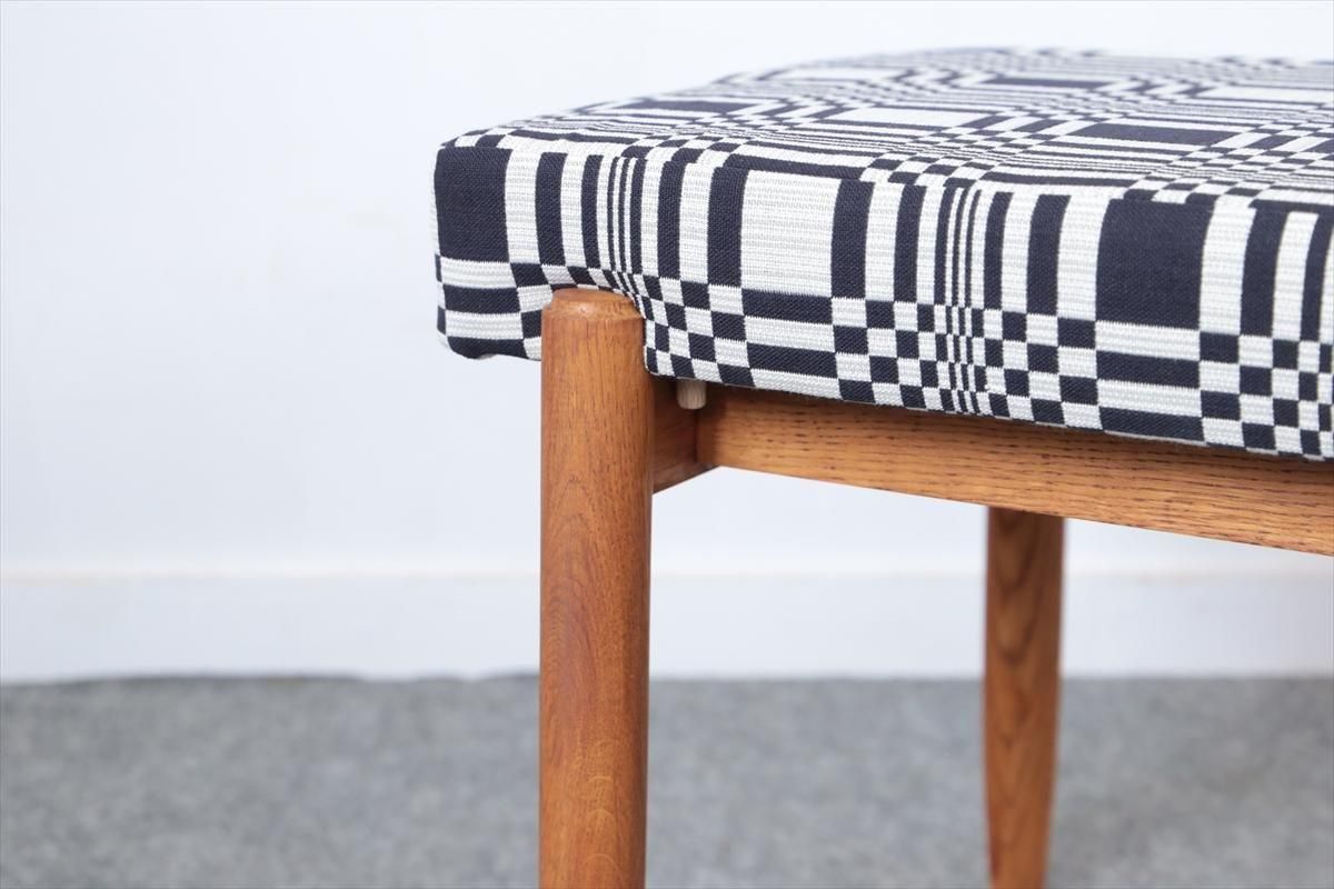 スウェーデンのオークのオットマンです。 クッション部分は土台に乗せているだけで、簡単に取り外せる仕様です。 ズレ防止のために座面の裏に画像のようなダボが付いています。 ソファに合わせるオットマンとして、またスツールとしてもお楽しみいただけることと思います。 生地はフィンランドのテキスタイルブランドJohanna Gullichsen(ヨハンナ・グリクセン)の「Doris/ドリス(BK)」(綿100%)の生地で張替ました。グラフィックパターンを織りで表現したテキスタイルは、奥行のあるしっかりとした素材で、色合いも美しく、季節を通してお楽しみいただけます。 細かいキズなど多少使用感はありますが、良いコンディションです。