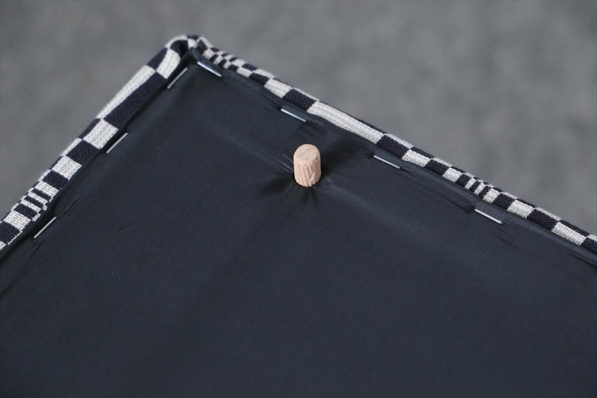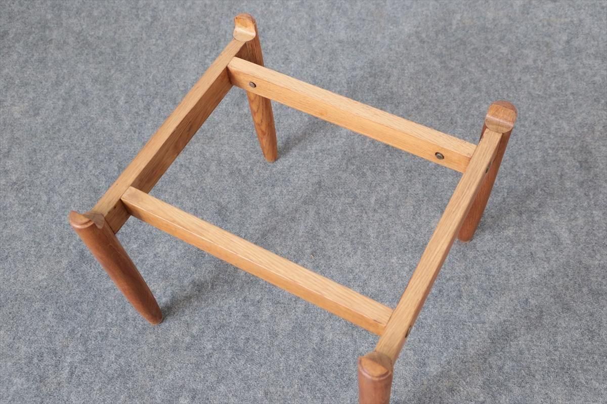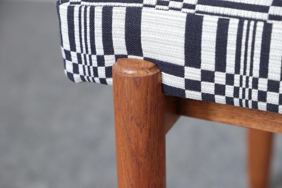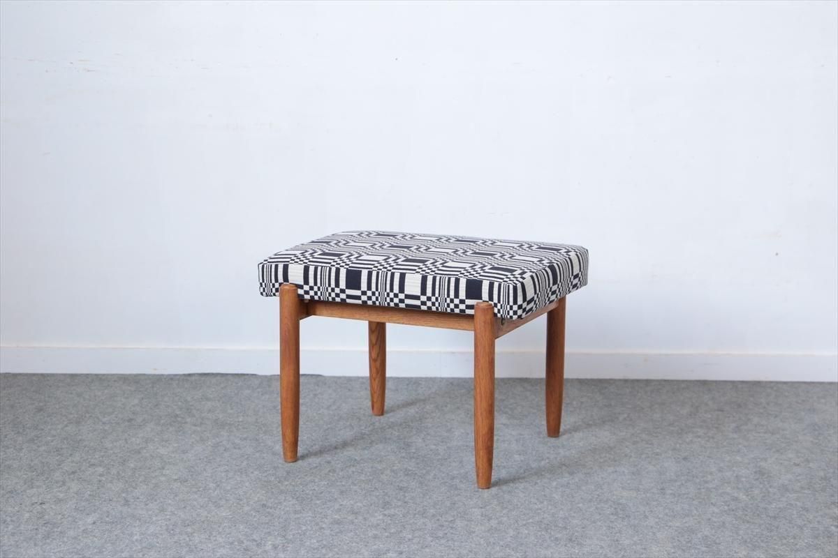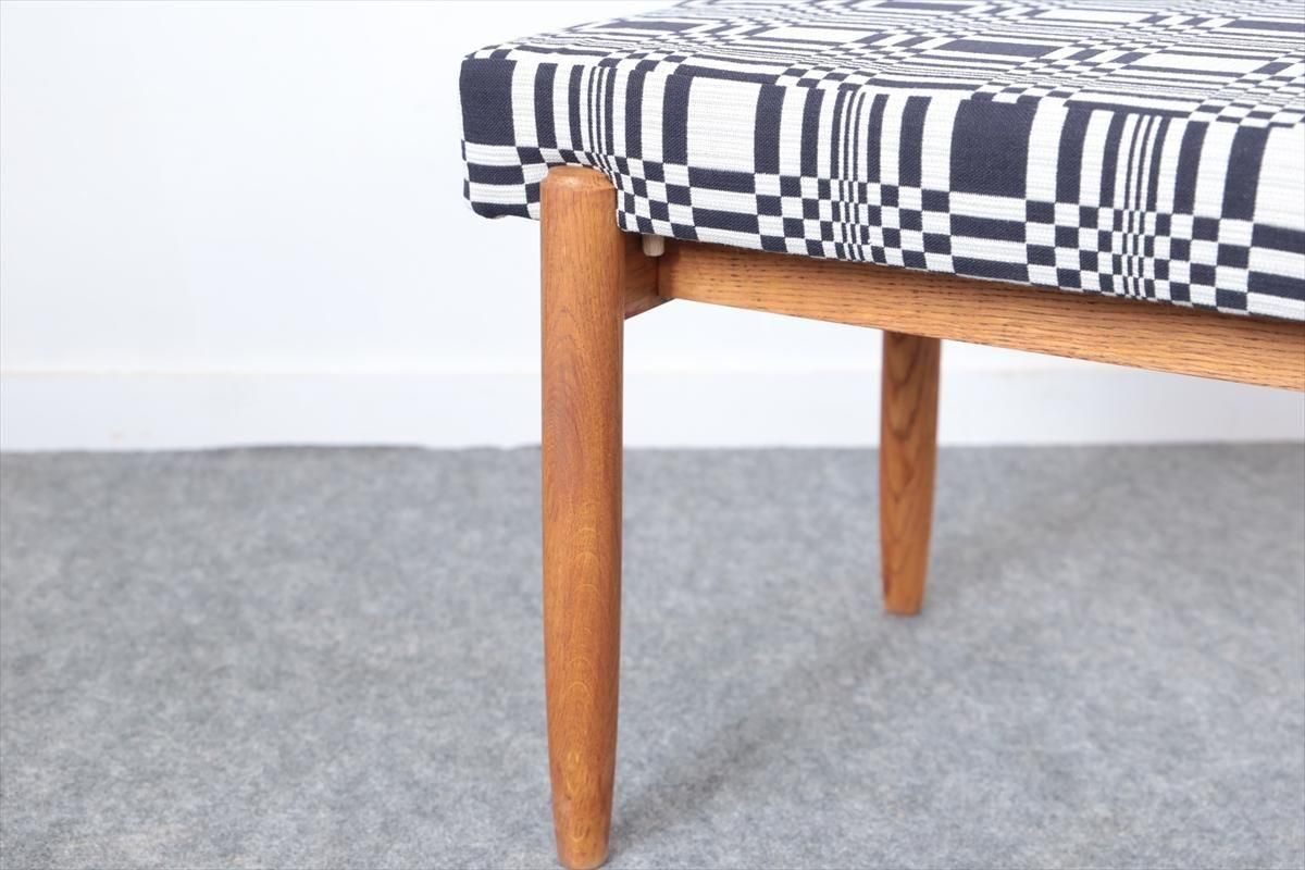 スウェーデンのオークのオットマンです。 クッション部分は土台に乗せているだけで、簡単に取り外せる仕様です。 ズレ防止のために座面の裏に画像のようなダボが付いています。 ソファに合わせるオットマンとして、またスツールとしてもお楽しみいただけることと思います。 生地はフィンランドのテキスタイルブランドJohanna Gullichsen(ヨハンナ・グリクセン)の「Doris/ドリス(BK)」(綿100%)の生地で張替ました。グラフィックパターンを織りで表現したテキスタイルは、奥行のあるしっかりとした素材で、色合いも美しく、季節を通してお楽しみいただけます。 細かいキズなど多少使用感はありますが、良いコンディションです。