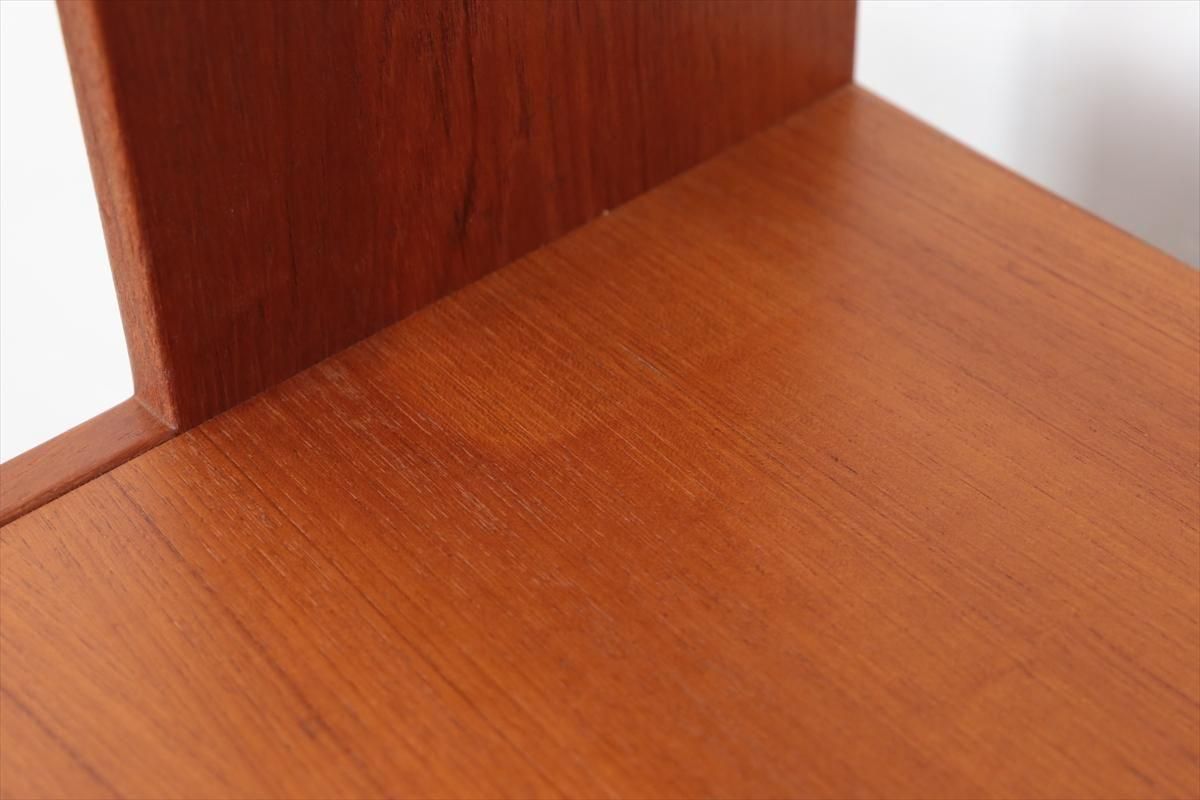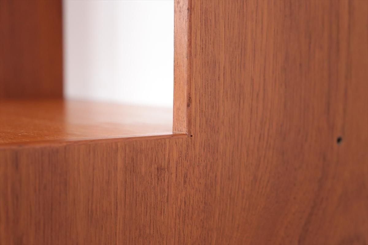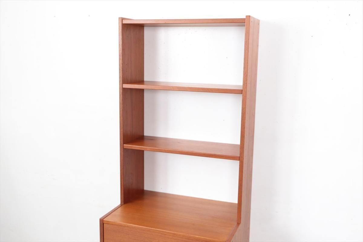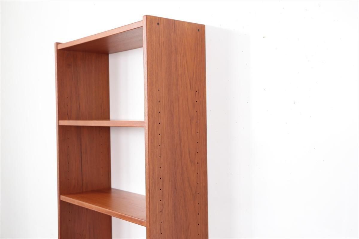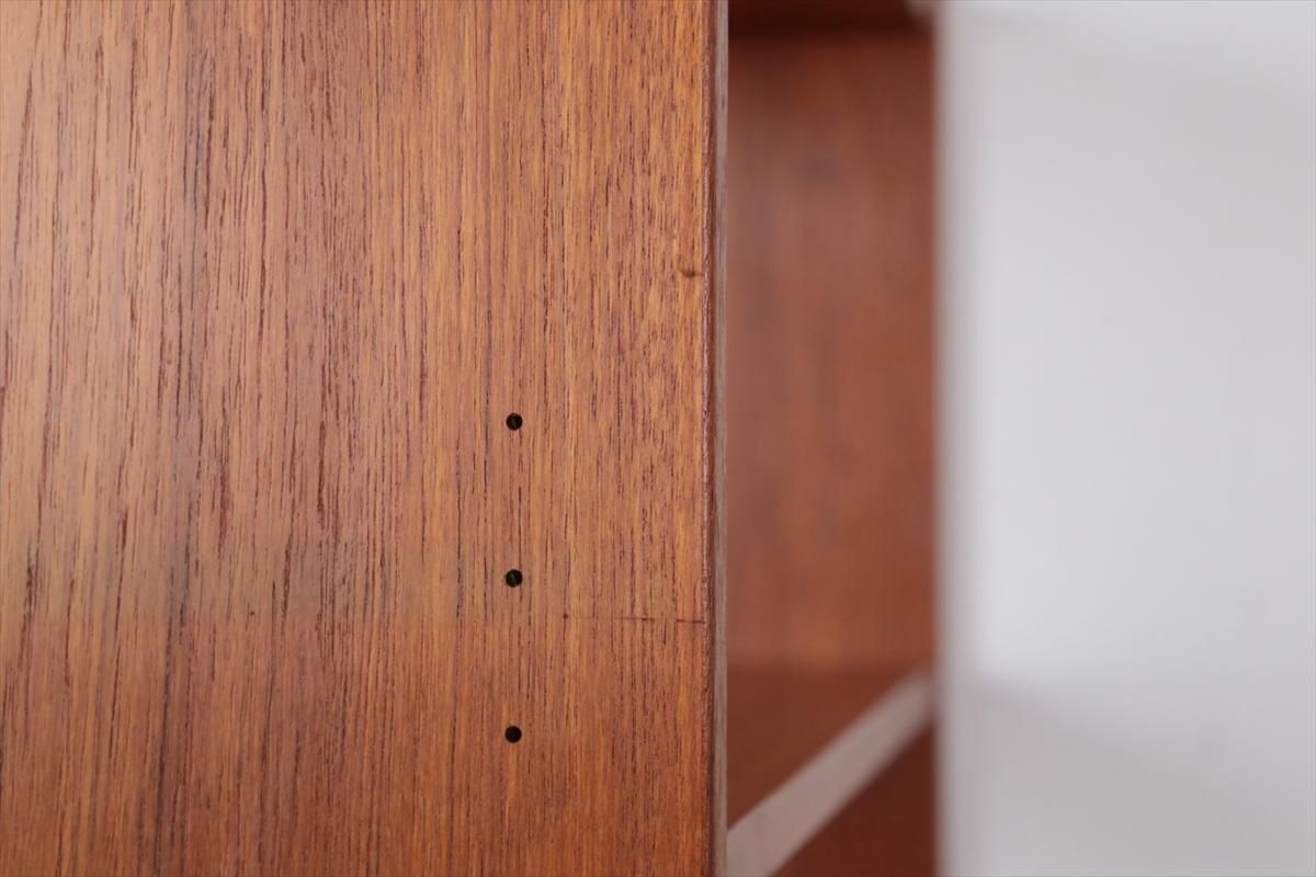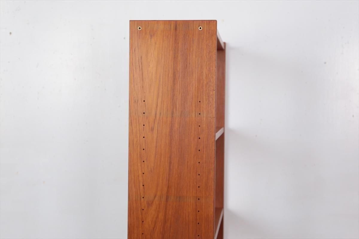 スウェーデンの家具メーカーRoyal Board社のチークのブックケースです。 幅が60cmとスリムでコンパクトなデザインで、当時横に同じシリーズの本棚を連結したりして、お部屋に合った組み合わせでディスプレイできたようです。横面の一部に日焼けの跡がありますが、これはその名残かもしれません。スリムで背板の無いデザインはお部屋をすっきりと見せてくれます。 上段の棚は16段階の高さ調節が可能です。 画像のように天板やフレームに小さなキズや、小さなしみがあります。 その他の細かいキズや凹みなど多少使用感はありますが、がたつきなどはなく良いコンディションです。