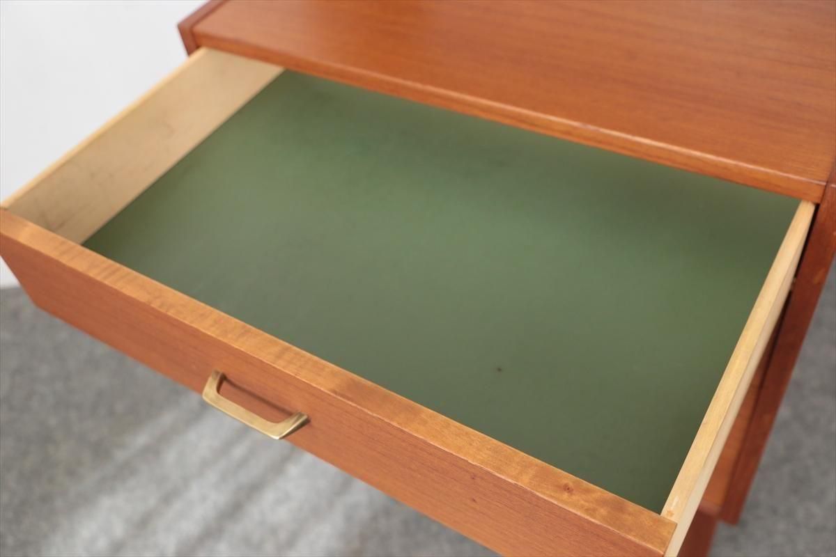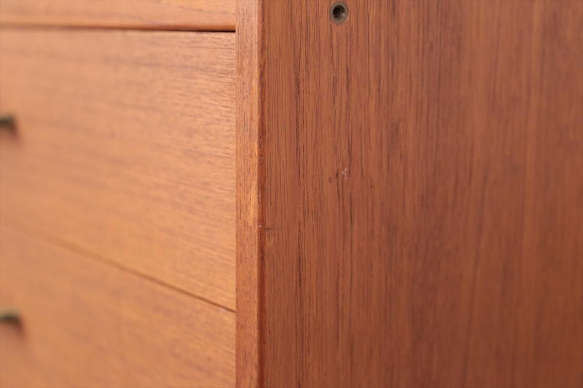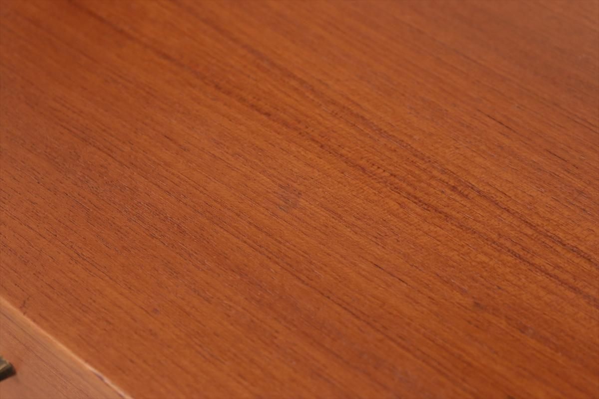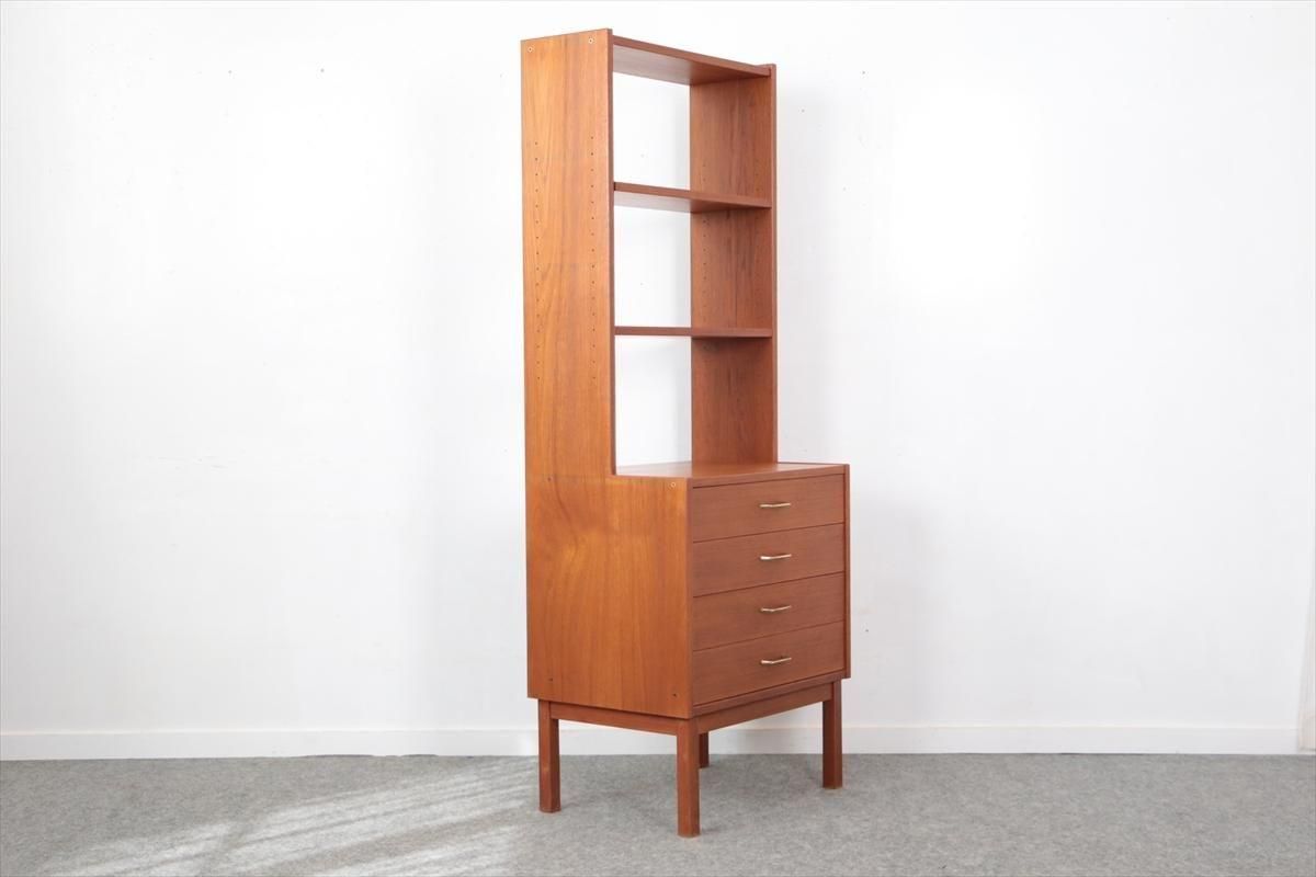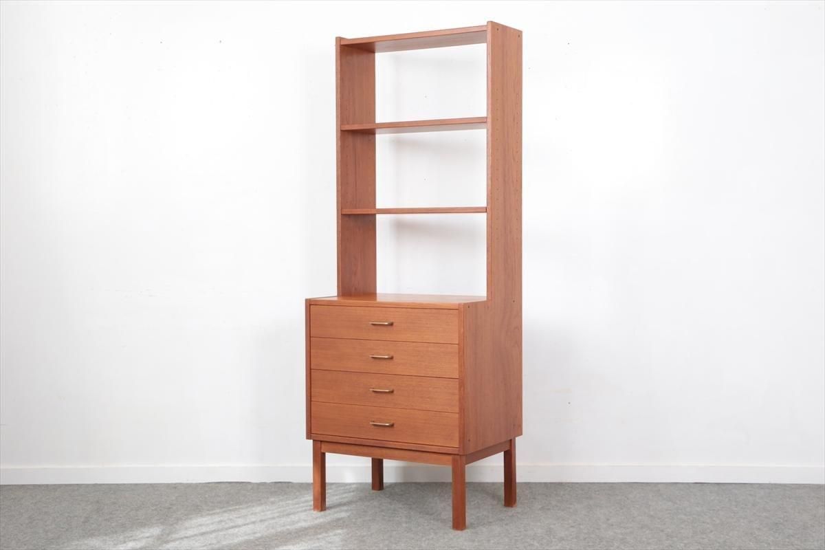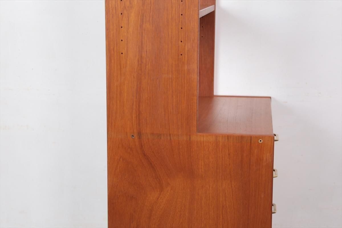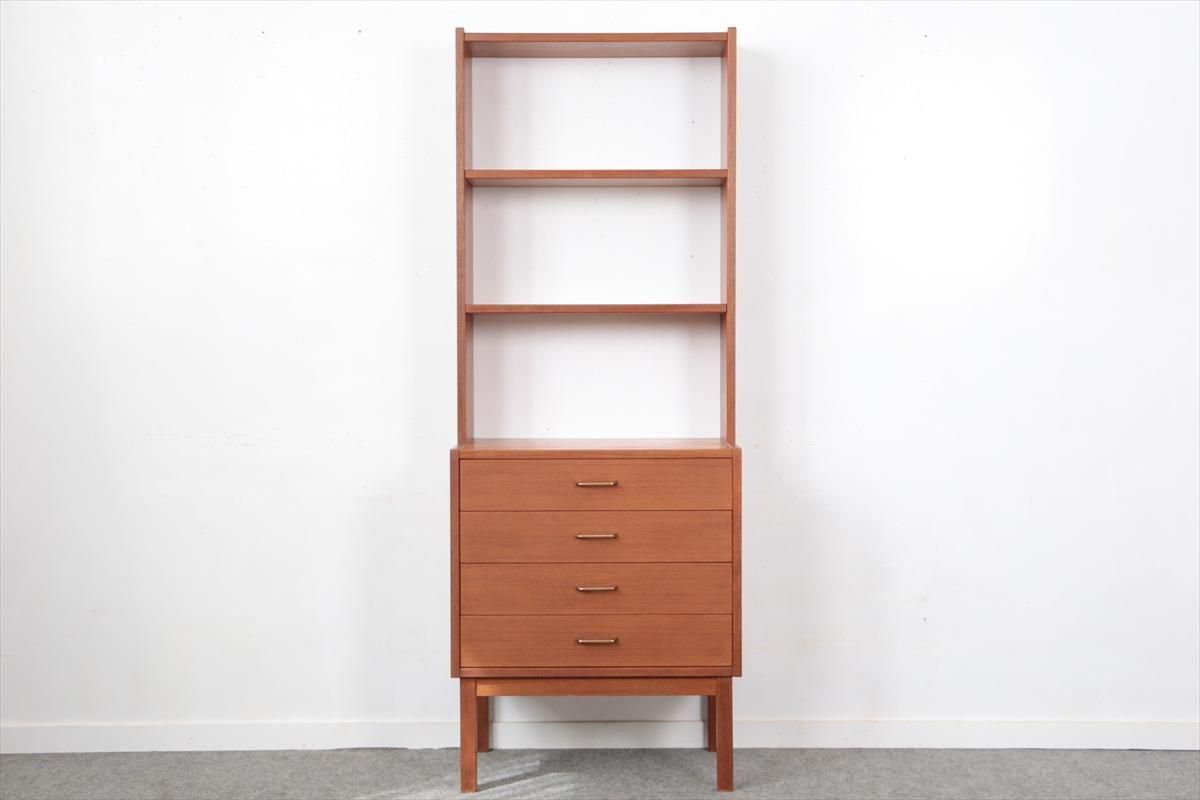 スウェーデンの家具メーカーRoyal Board社のチークのブックケースです。 幅が60cmとスリムでコンパクトなデザインで、当時横に同じシリーズの本棚を連結したりして、お部屋に合った組み合わせでディスプレイできたようです。横面の一部に日焼けの跡がありますが、これはその名残かもしれません。スリムで背板の無いデザインはお部屋をすっきりと見せてくれます。 上段の棚は16段階の高さ調節が可能です。 画像のように天板やフレームに小さなキズや、小さなしみがあります。 その他の細かいキズや凹みなど多少使用感はありますが、がたつきなどはなく良いコンディションです。