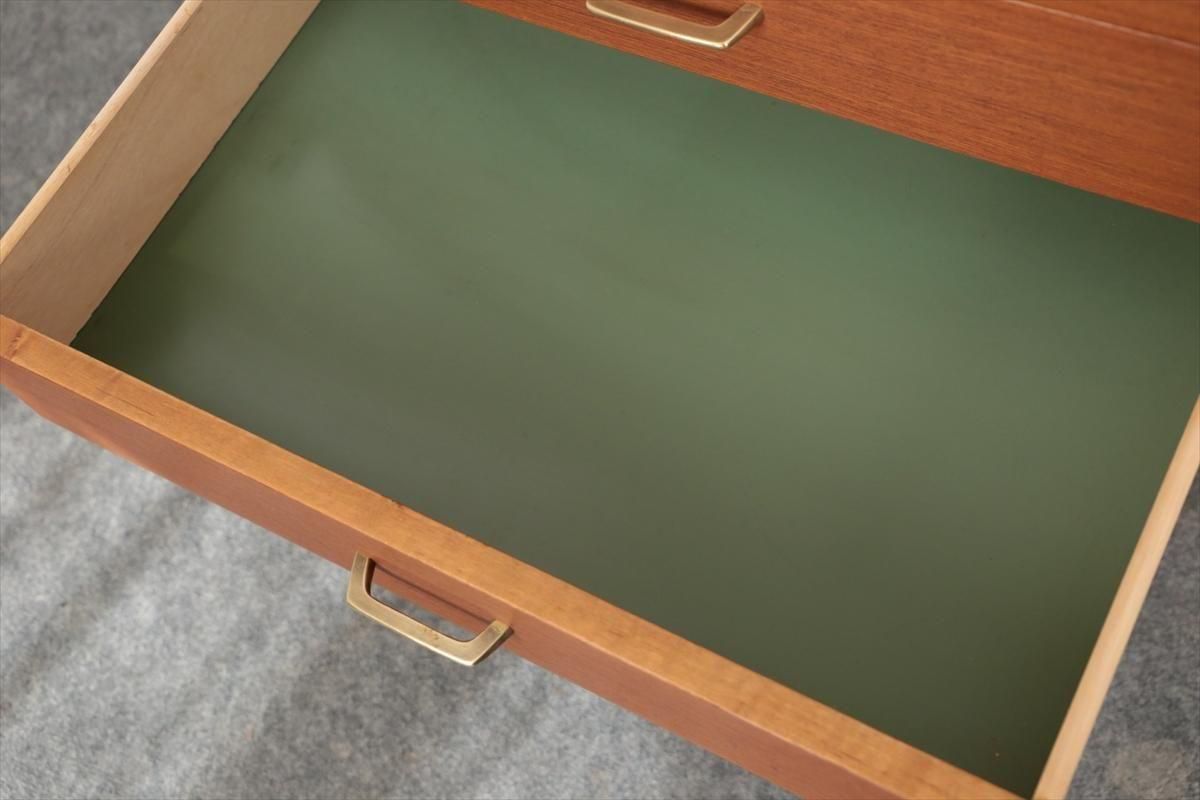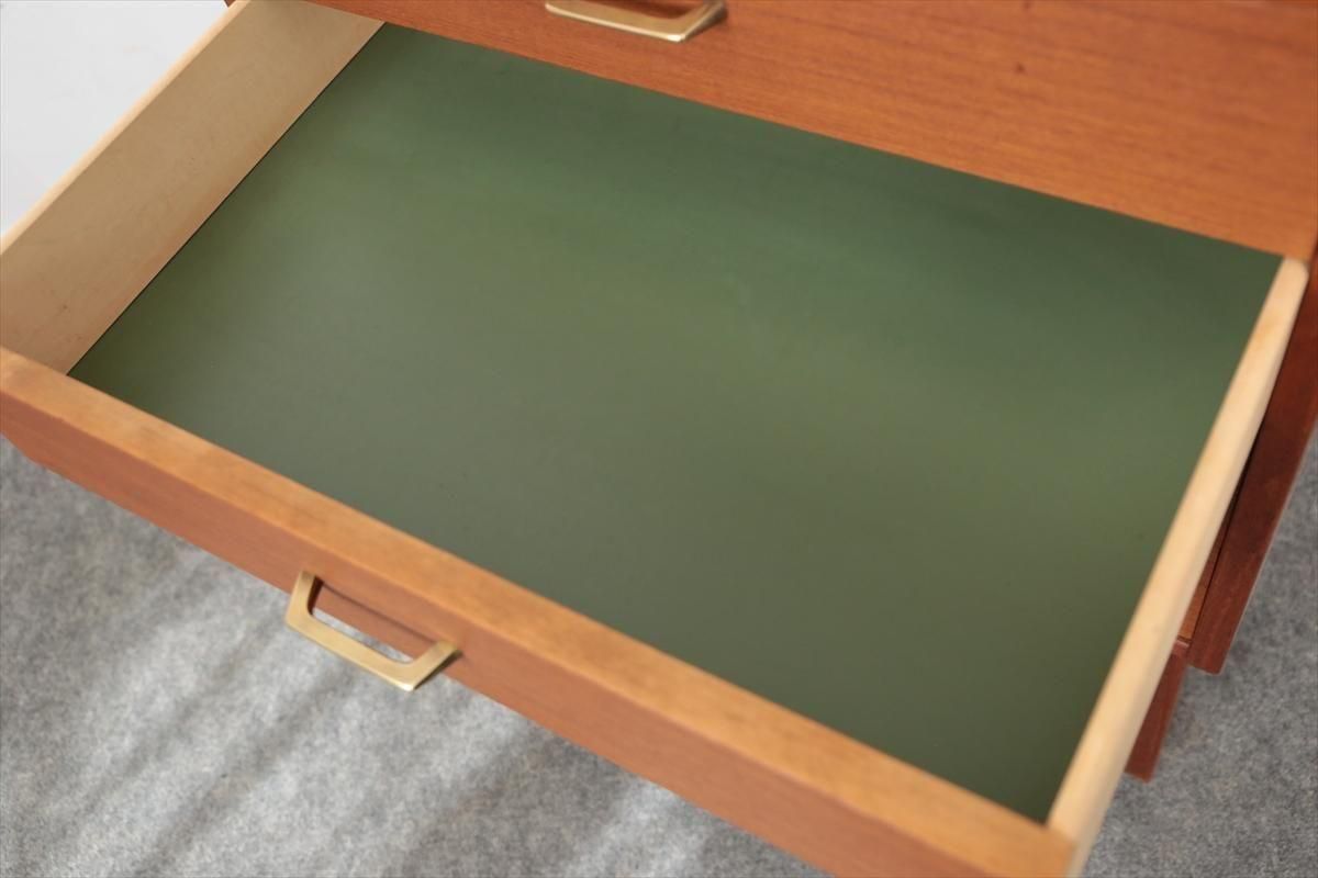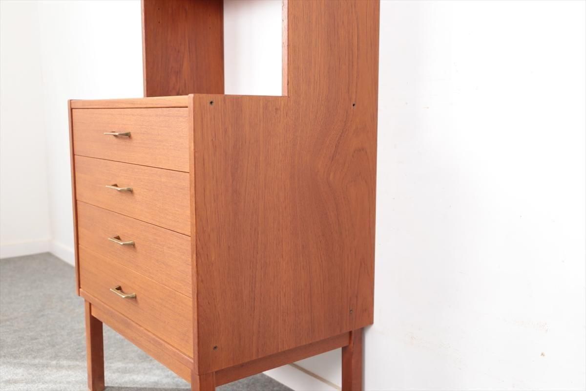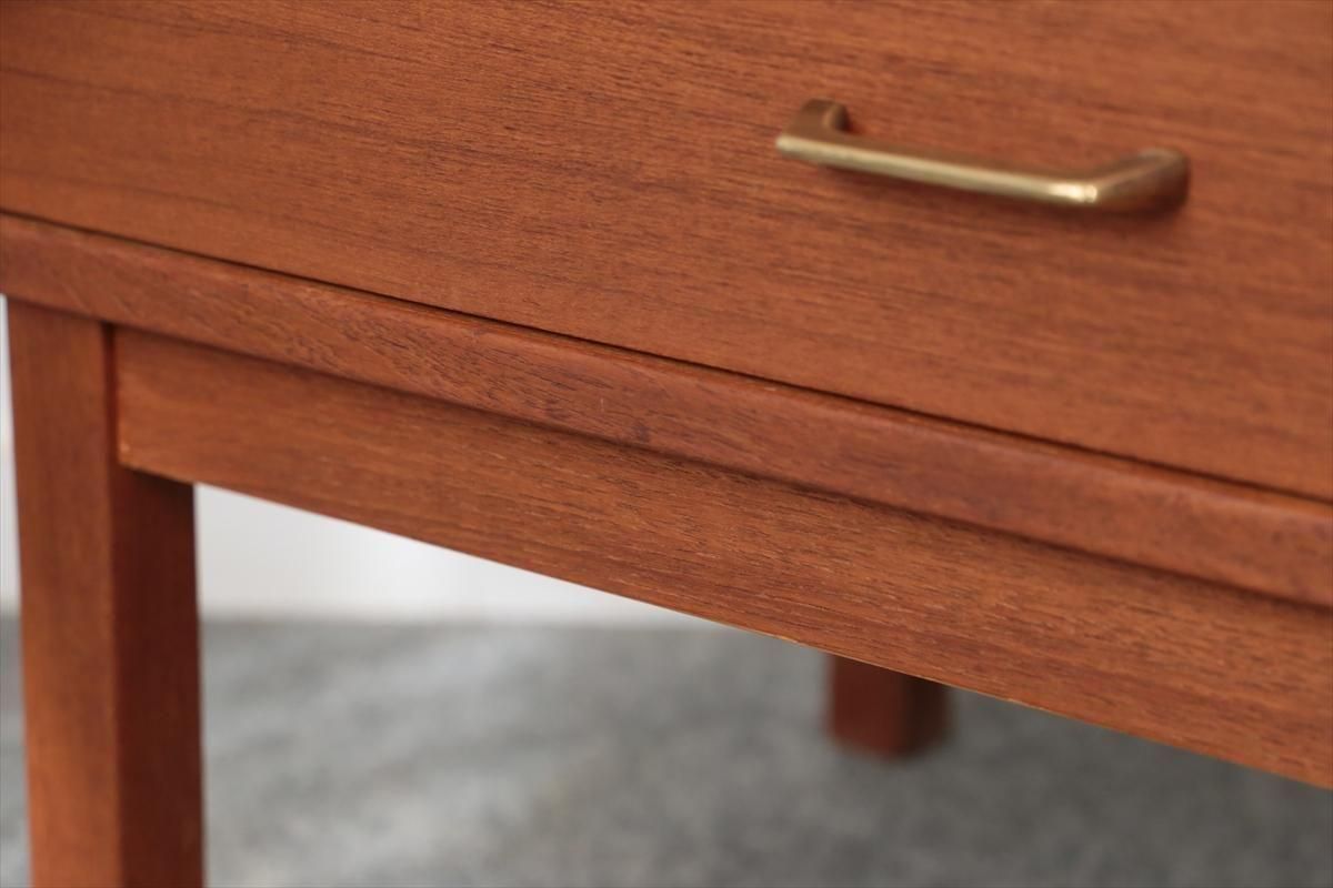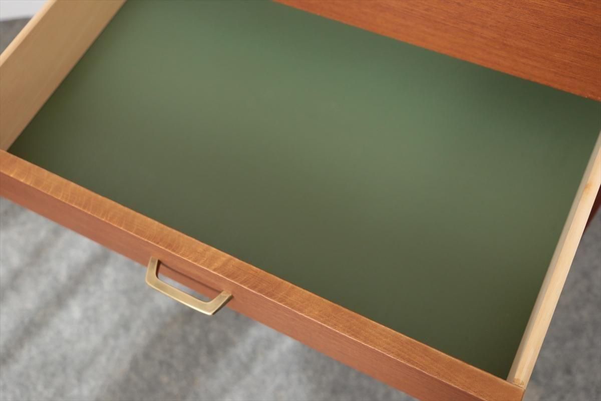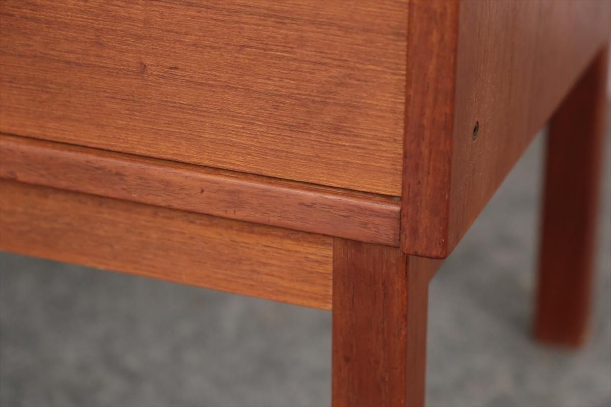 スウェーデンの家具メーカーRoyal Board社のチークのブックケースです。 幅が60cmとスリムでコンパクトなデザインで、当時横に同じシリーズの本棚を連結したりして、お部屋に合った組み合わせでディスプレイできたようです。横面の一部に日焼けの跡がありますが、これはその名残かもしれません。スリムで背板の無いデザインはお部屋をすっきりと見せてくれます。 上段の棚は16段階の高さ調節が可能です。 画像のように天板やフレームに小さなキズや、小さなしみがあります。 その他の細かいキズや凹みなど多少使用感はありますが、がたつきなどはなく良いコンディションです。