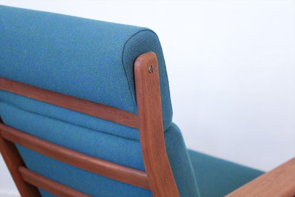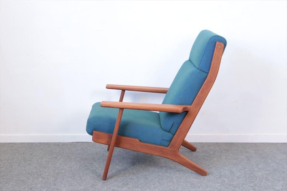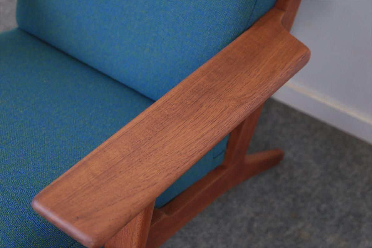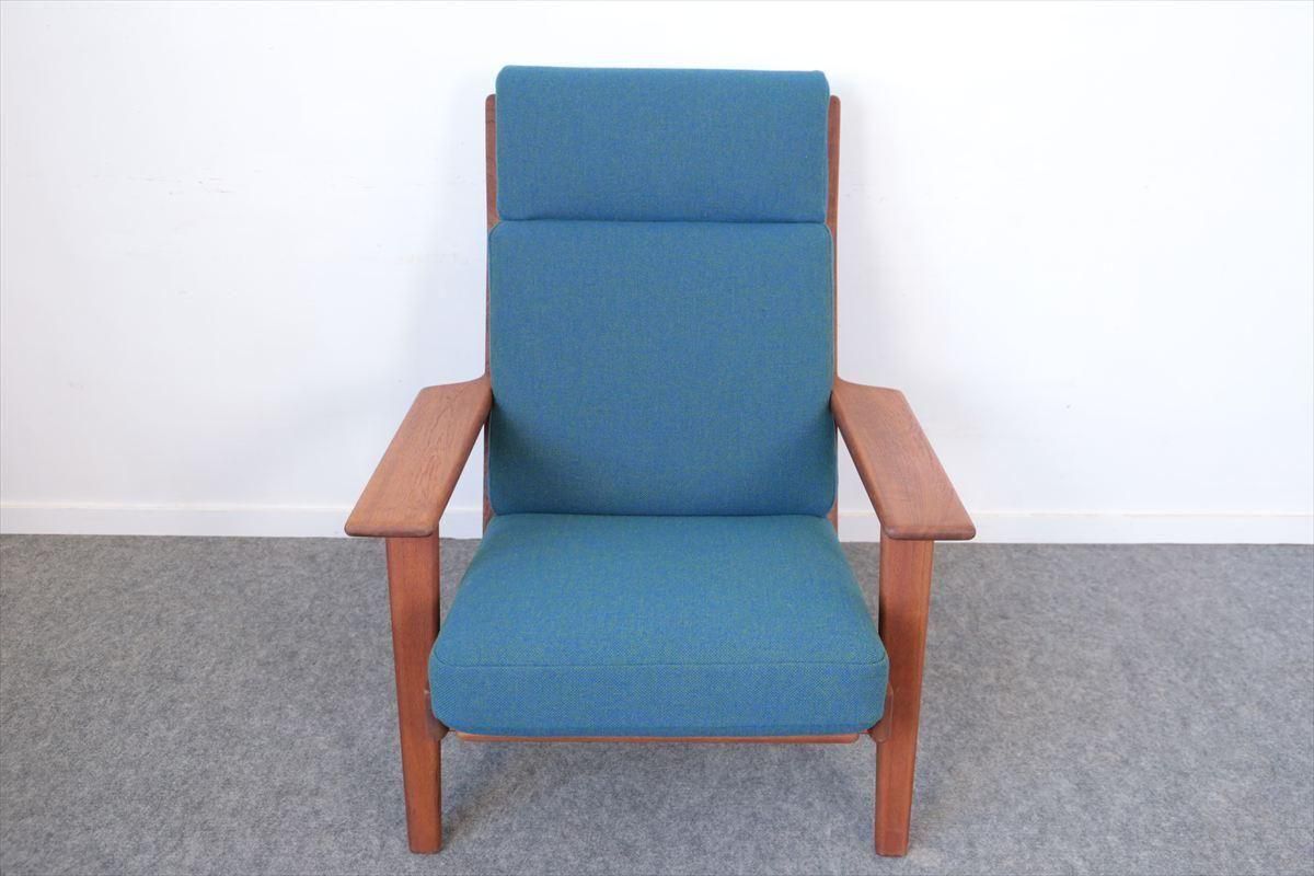 Hans J Wegner(ハンスJウェグナー)のハイバックチェアー「GE290A」です。 現在では希少になったチーク材タイプで、GE290はウェグナーの代表作のひとつで大変人気のあるシリーズです。直線的な平たいアームや、背面や横から見たシルエットはウェグナーならではのデザインです。 座の延長が後脚となった特徴的な構造によって、座り心地がとても良くゆったりとくつろぐことが出来ます。 またハイバックチェアーは頭部が支えられることにより長時間座っても疲れにくく快適な座り心地です。 座面下にはスプリングが張られ、クッションもスプリング内包の重みのあるしっかりとしたものです。中のウレタンは新しいものと交換しています。生地はデンマークのファブリックブランドKvadrat(クヴァドラ)のHallingdalシリーズ(素材:ウール70%・レーヨン30%)で張り替えています。ブルーとグリーンの混色が角度によって見え方が変わり、チークとの相性も良いです。 座面下のキルトは現在オリジナルのままですが、汚れや使用感があるため新しいキルトに交換予定です。その他木部の細かいキズなど多少使用感はありますが、全体的に良いコンディションです。