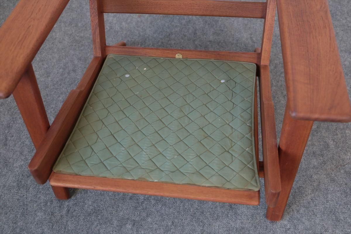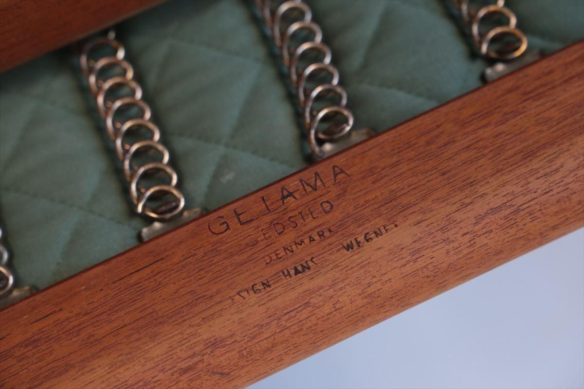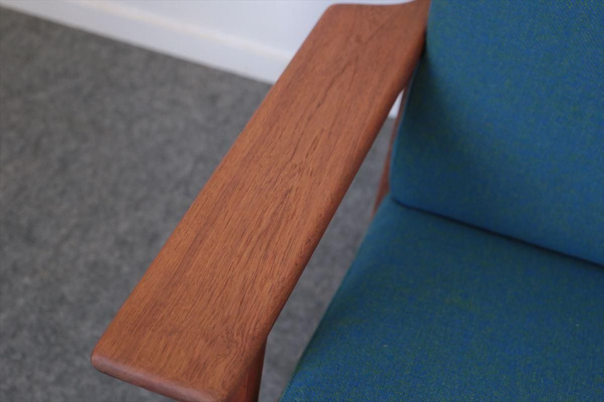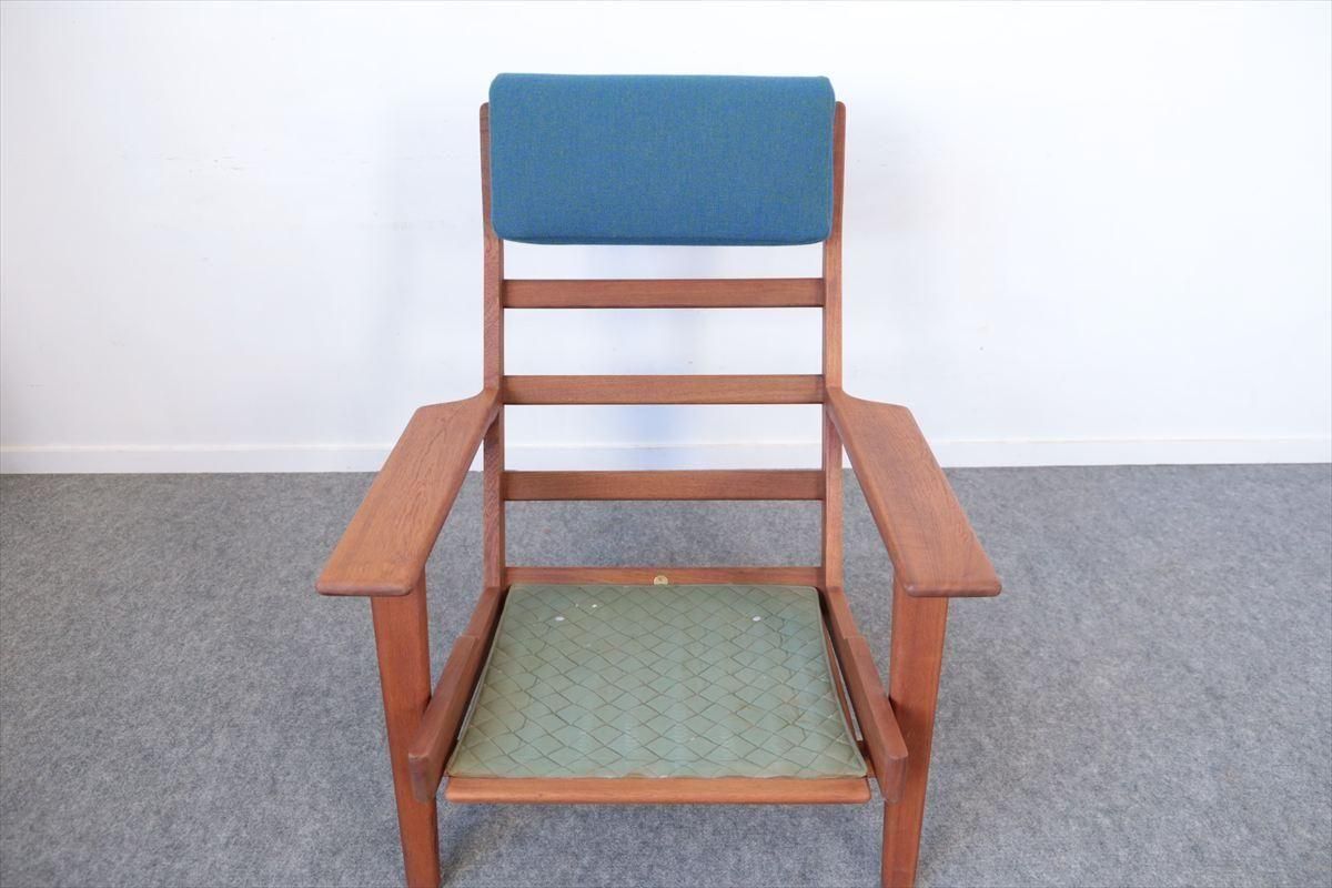 Hans J Wegner(ハンスJウェグナー)のハイバックチェアー「GE290A」です。 現在では希少になったチーク材タイプで、GE290はウェグナーの代表作のひとつで大変人気のあるシリーズです。直線的な平たいアームや、背面や横から見たシルエットはウェグナーならではのデザインです。 座の延長が後脚となった特徴的な構造によって、座り心地がとても良くゆったりとくつろぐことが出来ます。 またハイバックチェアーは頭部が支えられることにより長時間座っても疲れにくく快適な座り心地です。 座面下にはスプリングが張られ、クッションもスプリング内包の重みのあるしっかりとしたものです。中のウレタンは新しいものと交換しています。生地はデンマークのファブリックブランドKvadrat(クヴァドラ)のHallingdalシリーズ(素材:ウール70%・レーヨン30%)で張り替えています。ブルーとグリーンの混色が角度によって見え方が変わり、チークとの相性も良いです。 座面下のキルトは現在オリジナルのままですが、汚れや使用感があるため新しいキルトに交換予定です。その他木部の細かいキズなど多少使用感はありますが、全体的に良いコンディションです。